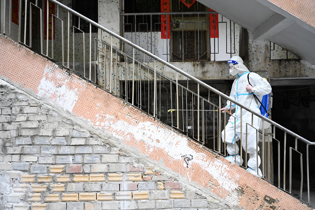 3月29日,在福建省泉州市豐澤區(qū)一處封控小區(qū)內(nèi),徐航進(jìn)行消殺作業(yè)。新華社發(fā)(周義攝)