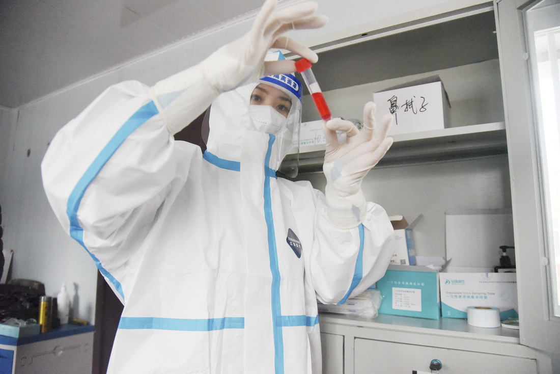 3月29日,在河北省遵化市人民醫(yī)院,脫去防護(hù)服的核酸檢測(cè)員雷蕾在試劑配制區(qū)操作臺(tái)。新華社發(fā)(劉滿倉(cāng)攝)