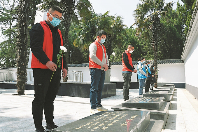 4月3日,淮安市洪澤區(qū)東雙溝鎮(zhèn)新時(shí)代文明實(shí)踐所組織志愿者,代表英烈家屬祭掃烈士墓,寄托哀思。 劉彬 攝 (視覺(jué)江蘇網(wǎng)供圖)