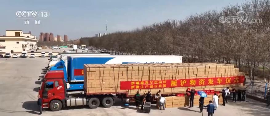 4月7日下午4時(shí),由新疆維吾爾自治區(qū)及新疆生產(chǎn)建設(shè)兵團(tuán)籌備的特色干果、馕等10萬份愛心物資從烏魯木齊裝車發(fā)往上海。