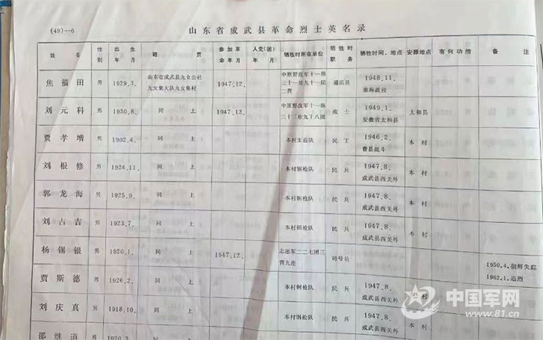 文章中注明“焦像田”烈士的原籍是“成武縣九女榮村”,成武縣退役軍人事務(wù)局經(jīng)過(guò)摸排,發(fā)現(xiàn)現(xiàn)在的九女集鎮(zhèn)并沒(méi)有“榮村”這一地名。是否是解放前的地名?還是解放后行政區(qū)劃更改了?查閱成武縣烈士英名錄、史志和軍事志等資料的同志,翻遍了有關(guān)檔案也沒(méi)有見(jiàn)到這個(gè)烈士名字。他們與淮海戰(zhàn)役烈士陵園聯(lián)系,進(jìn)一步了解烈士信息,并通過(guò)走訪老兵,在縣有關(guān)媒體轉(zhuǎn)發(fā)尋親信息等方式,開(kāi)展了社會(huì)化尋找。一天下來(lái),沒(méi)有任何線索。