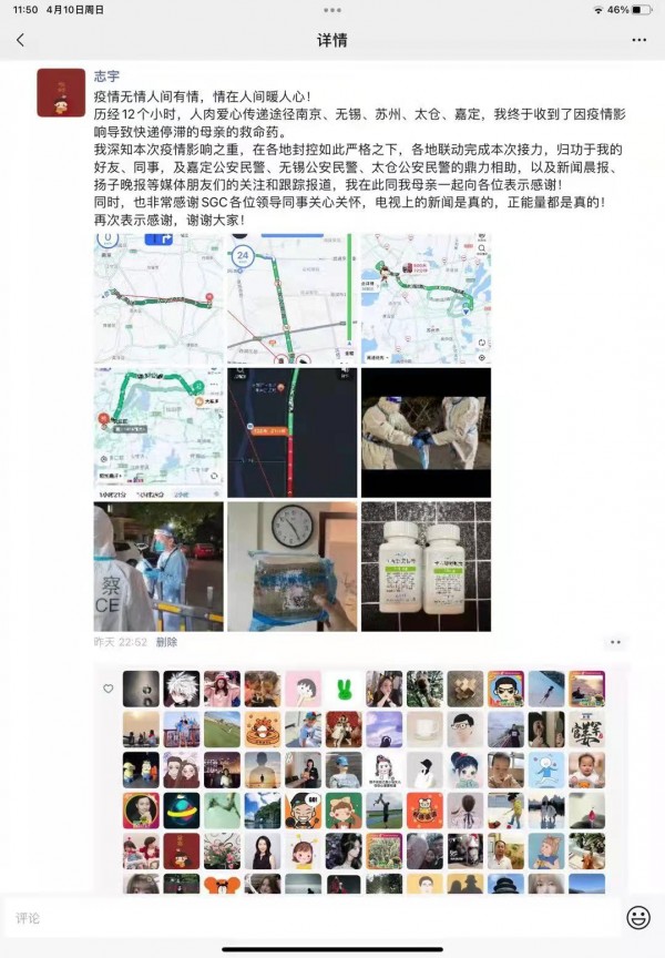 4月9日7時10分,陳先生發(fā)了一條朋友圈求助:“各位親朋好友,我現(xiàn)在急需南京的朋友人肉接力幫我媽緊急送個藥”“此藥巨貴且難買,如果大家誰有辦法完成接力,或部分路段的接力,請速與我聯(lián)系,非常感謝”。陳先生的求助引起大家的廣泛關注,朋友圈內紛紛響應、并出謀劃策。