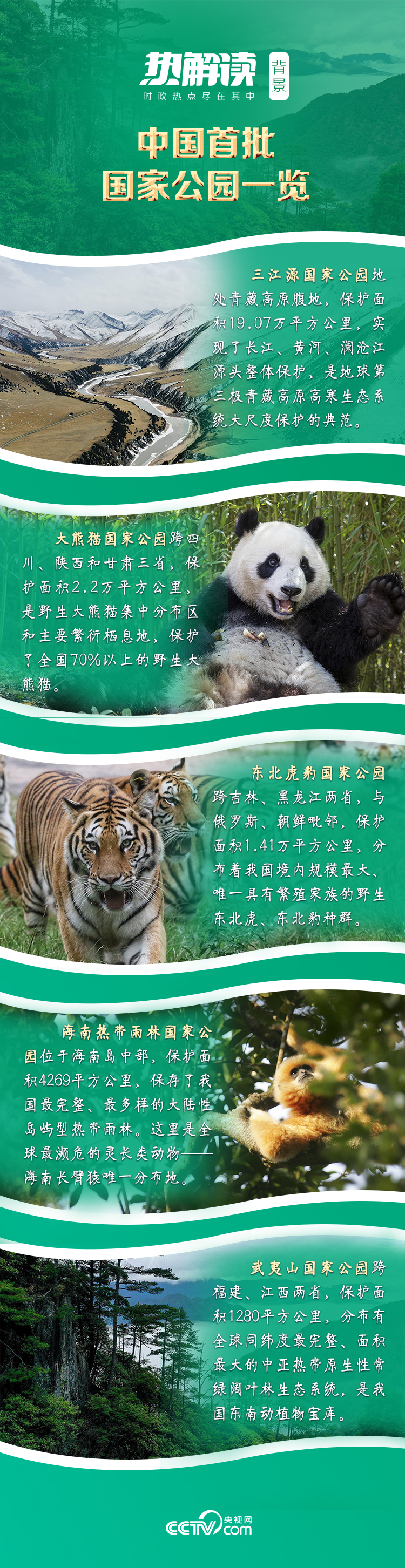 “中華水塔”三江源、竹林幽幽的熊貓樂園、東北原始森林的虎豹天堂、海南島的熱帶雨林、碧水丹霞的武夷山……首批設(shè)立的5個(gè)國家公園保護(hù)面積超過23萬平方公里,涵蓋近30%的陸域國家重點(diǎn)保護(hù)野生動植物種類。