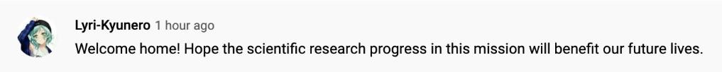 “歡迎回家!希望此次任務(wù)中的科研進(jìn)展可以造福我們的未來!
