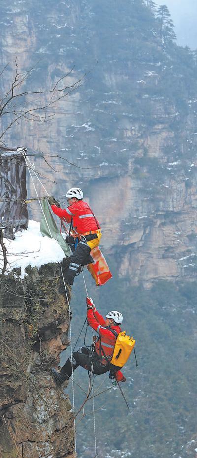 湖南省張家界市武陵源山地應(yīng)急救援隊(duì)隊(duì)員在黃石寨的巖壁上索降,準(zhǔn)備撿拾垃圾,以保護(hù)當(dāng)?shù)厣鷳B(tài)環(huán)境。 吳勇兵攝(影像中國(guó))