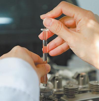山東省濟(jì)南市歷下環(huán)境監(jiān)控中心,工作人員正在進(jìn)行污染物的測(cè)定。 徐 舟攝(影像中國(guó))