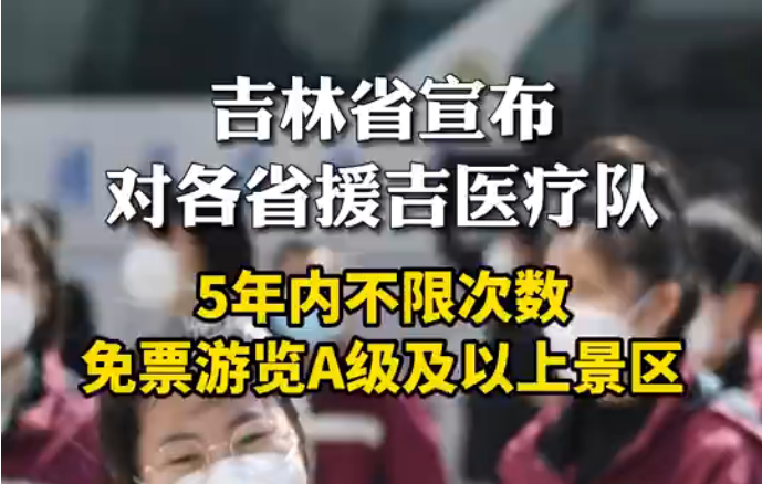 【馳援吉林醫(yī)療隊(duì)可免票到吉旅游】吉林省宣布:各省份援吉醫(yī)療隊(duì)隊(duì)員,可攜4位家屬,5年內(nèi)不限次數(shù)免門票游覽吉林省A級及以上旅游景區(qū)!