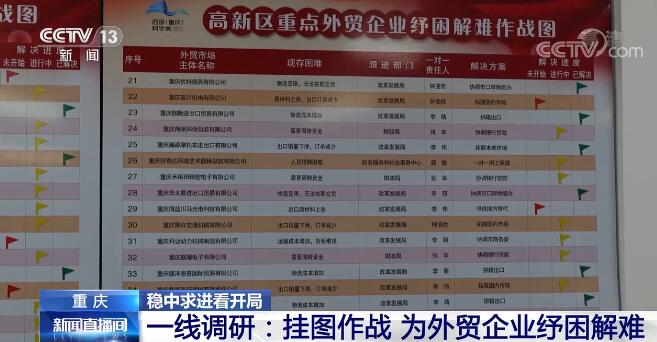 針對(duì)企業(yè)的難點(diǎn)和痛點(diǎn),在重慶高新區(qū)自貿(mào)局,一張覆蓋當(dāng)?shù)?0多家重點(diǎn)外貿(mào)企業(yè)的作戰(zhàn)圖十分醒目。展板上,每個(gè)企業(yè)目前的困難、解決方案、進(jìn)度和責(zé)任人等信息一目了然。