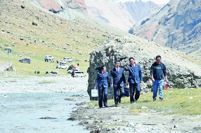 西藏自治區(qū)人民檢察院阿里分院檢察官與生態(tài)環(huán)境部門工作人員一起巡查河道。鐘心宇攝/光明圖片