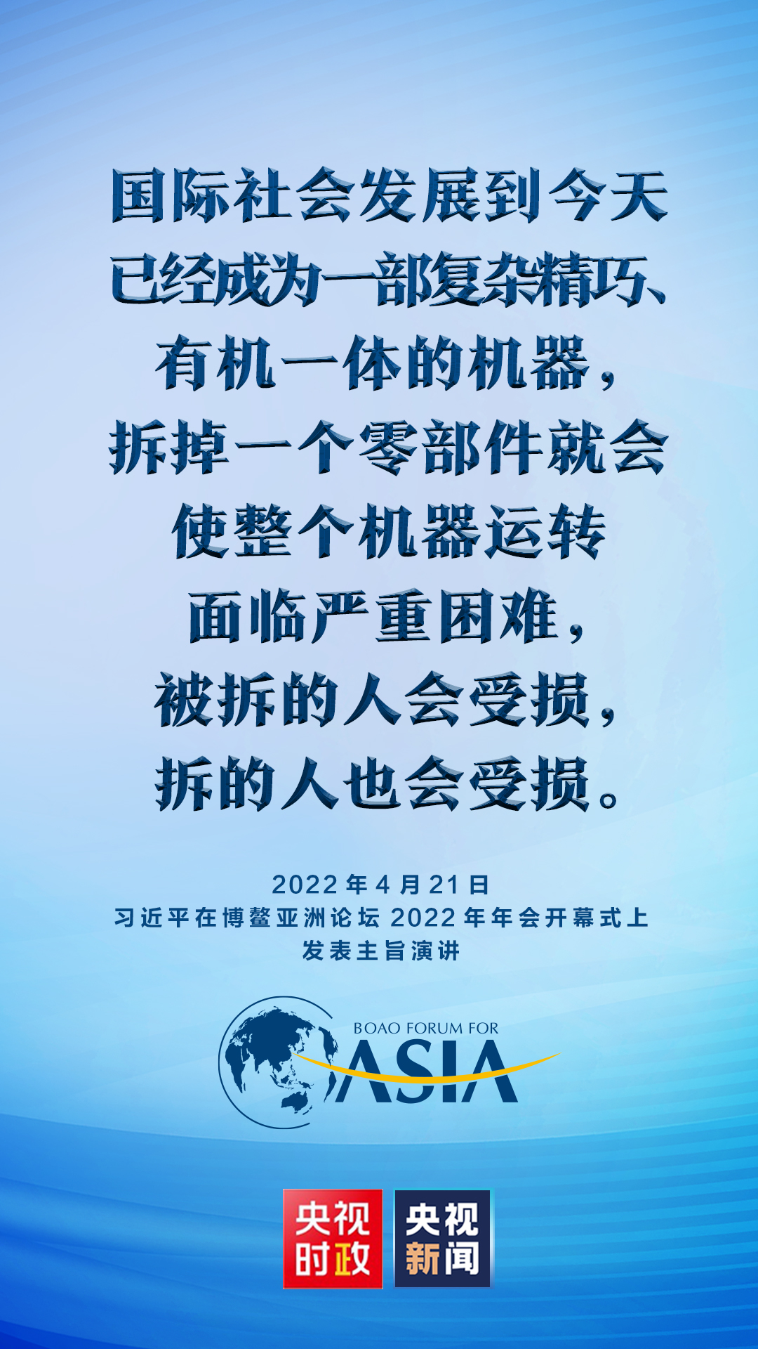 習(xí)近平說:“世界各國乘坐在一條命運與共的大船上,要穿越驚濤駭浪、駛向光明未來,必須同舟共濟(jì),企圖把誰扔下大海都是不可接受的。國際社會發(fā)展到今天已經(jīng)成為一部復(fù)雜精巧、有機(jī)一體的機(jī)器,拆掉一個零部件就會使整個機(jī)器運轉(zhuǎn)面臨嚴(yán)重困難,被拆的人會受損,拆的人也會受損。”