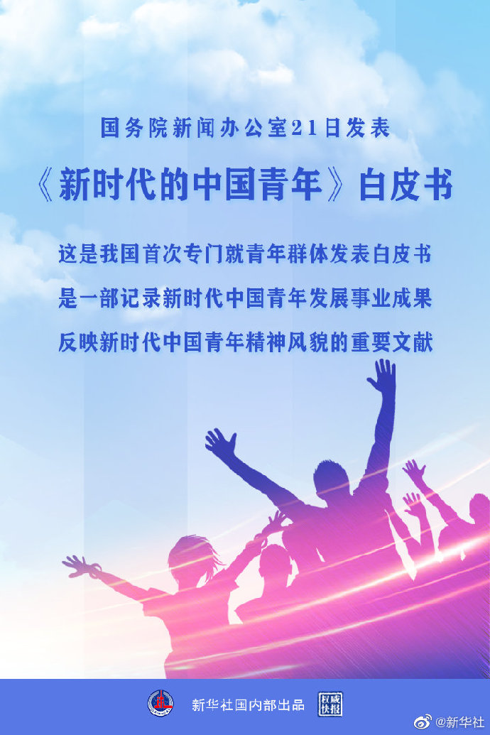 國(guó)務(wù)院新聞辦公室4月21日發(fā)表《新時(shí)代的中國(guó)青年》白皮書。這是我國(guó)首次專門就青年群體發(fā)表白皮書。白皮書全面介紹了新時(shí)代黨和政府為青年發(fā)展創(chuàng)造的良好條件、取得的巨大成就,充分展現(xiàn)了新時(shí)代中國(guó)青年奮進(jìn)新征程、建功新時(shí)代的青春擔(dān)當(dāng),是一部記錄新時(shí)代中國(guó)青年發(fā)展事業(yè)成果、反映新時(shí)代中國(guó)青年精神風(fēng)貌的重要文獻(xiàn)。(記者黃玥、董博婷、張研,海報(bào)設(shè)計(jì)喬昕)