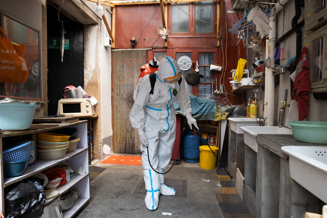工作人員在黃浦區(qū)豫園街道廣福居民區(qū)消殺通道(4月19日攝)。新華社記者 金立旺 攝