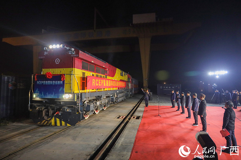 RCEP生效后首趟國際貨運班列從廣西南寧啟程。人民網(wǎng) 吳明江攝