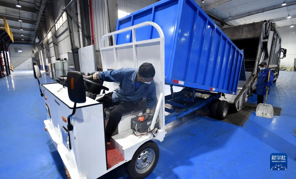 4月28日,工作人員在轉(zhuǎn)運(yùn)分揀加工后的垃圾。