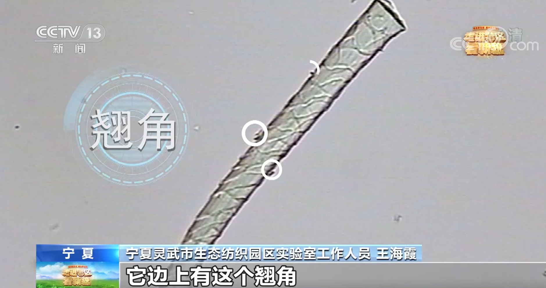 寧夏靈武市生態(tài)紡織園區(qū)實(shí)驗(yàn)室工作人員 王海霞:羊毛纖維大家看到了,它邊上有這個(gè)翹角,貼身穿的話會(huì)有刺癢感。那我們現(xiàn)在有一個(gè)技術(shù),就是把我們羊毛那個(gè)翹出來的角剝掉一點(diǎn)點(diǎn)。(一點(diǎn)點(diǎn)有多少?)0.2個(gè)微米,約等于我們頭發(fā)(直徑)的三百分之一。