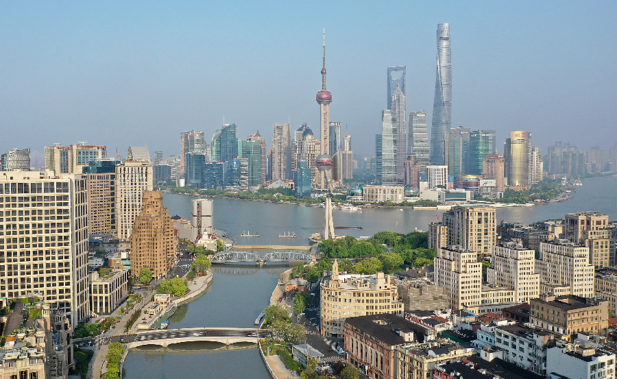 ↑“靜態(tài)”管理之下,上海乍浦路橋和外白渡橋少了往日的車流(4月21日攝,無人機(jī)照片)。