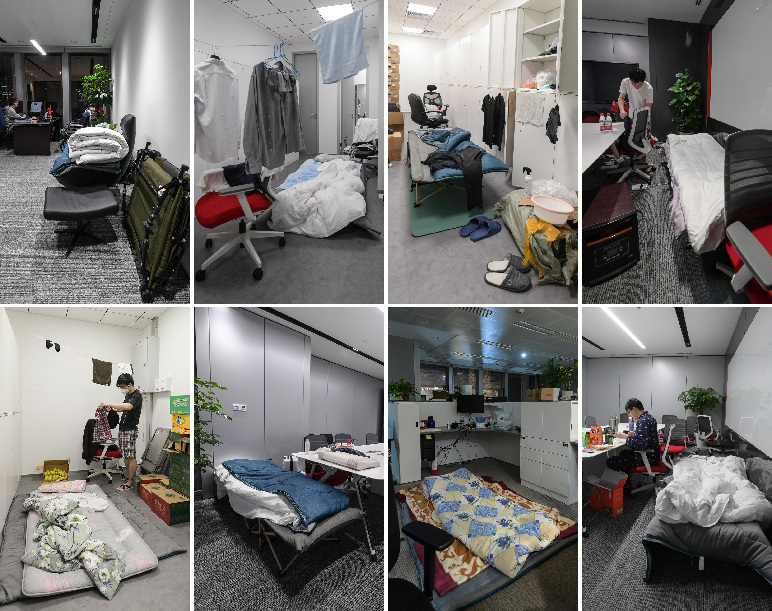 ↑這是記者在封閉管理期間拍攝的工商銀行上海分行金融市場(chǎng)部堅(jiān)守崗位的部分員工的住處。員工們將會(huì)議室、更衣間臨時(shí)改成單人宿舍用于休息(拼版照片,4月14日攝)。