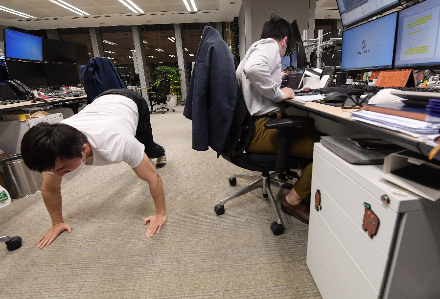 ↑4月14日,工商銀行上海分行金融市場(chǎng)部市場(chǎng)營(yíng)銷科科長(zhǎng)黃碩喆(左)在空閑時(shí)做起了俯臥撐。