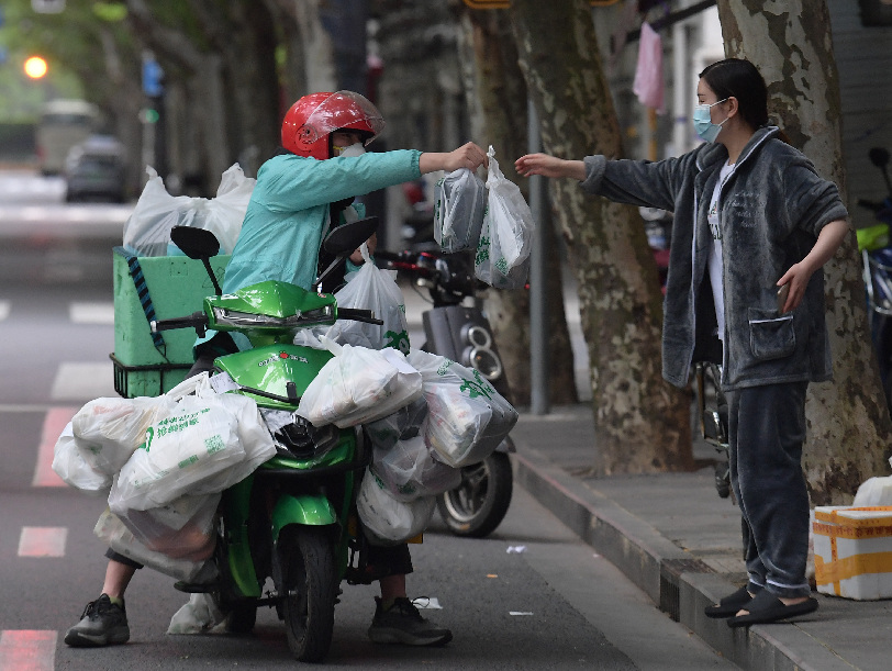 ↑一位快遞小哥在上海市黃浦區(qū)興安路為居民送貨(4月28日攝)。
