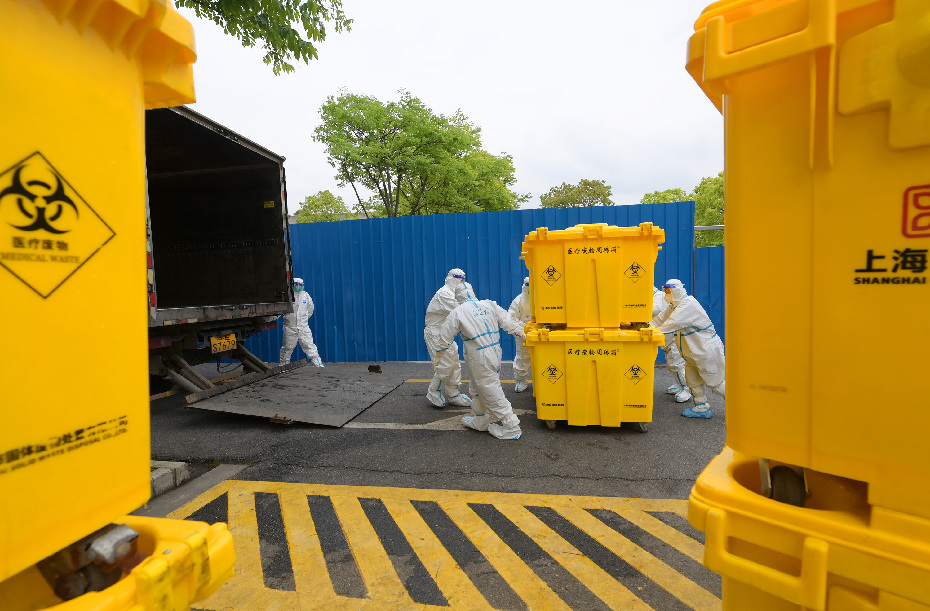 ↑4月30日,上海環(huán)境集團(tuán)工作人員在上海市仁濟(jì)醫(yī)院南院區(qū)(新冠定點(diǎn)醫(yī)院)收集醫(yī)廢。