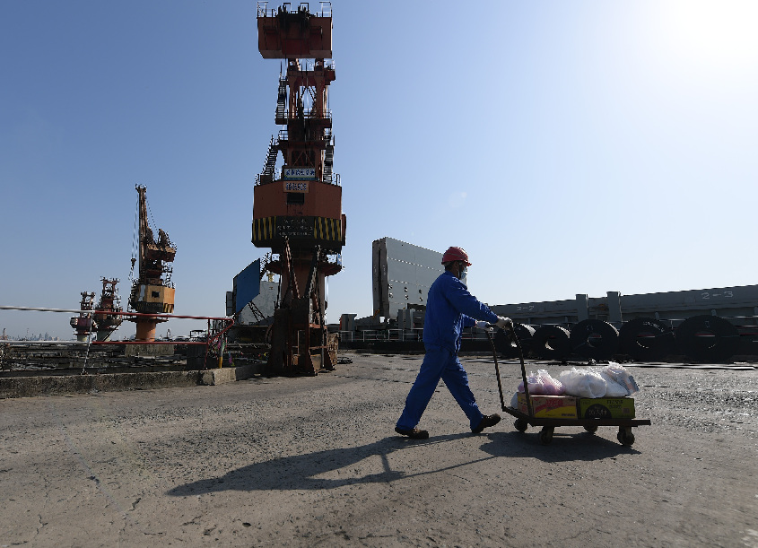 ↑4月11日,楊浦區(qū)海保碼頭工作人員在作業(yè)區(qū)幫忙轉(zhuǎn)運(yùn)訂單貨物。當(dāng)日,因封控措施被困碼頭的船主張同華向商家訂購(gòu)了食物,但因?yàn)榇a頭的防疫規(guī)定無法交接,了解情況后,碼頭管理者與配送人員接力,將訂單貨物送到張同華手中。