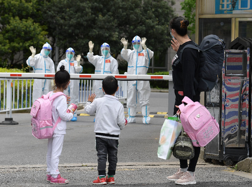 ↑4月30日,走出醫(yī)院準(zhǔn)備回家時(shí),小華(前中)和姐姐、媽媽(右一)一起回身向護(hù)送他們出院的醫(yī)護(hù)人員揮手道別。當(dāng)日,由上海交通大學(xué)醫(yī)學(xué)院附屬仁濟(jì)醫(yī)院南部院區(qū)(新冠定點(diǎn)醫(yī)院)收治的3歲重癥新冠患者小華(化名)出院。