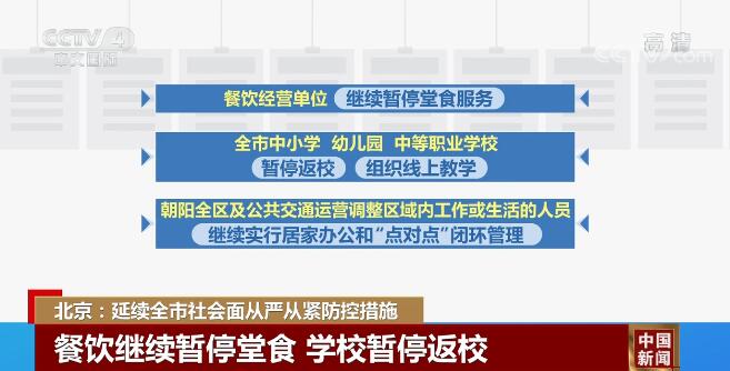餐飲經(jīng)營單位繼續(xù)暫停堂食服務(wù)。全市中小學(xué)、幼兒園、中等職業(yè)學(xué)校暫停返校,組織線上教學(xué)。朝陽全區(qū)及公共交通運營調(diào)整區(qū)域內(nèi)工作或生活的人員,繼續(xù)實行居家辦公和“點對點”閉環(huán)管理,中央和國家機關(guān)、央屬企事業(yè)單位、大型總部企業(yè)原則上保持不高于50%的到崗率。