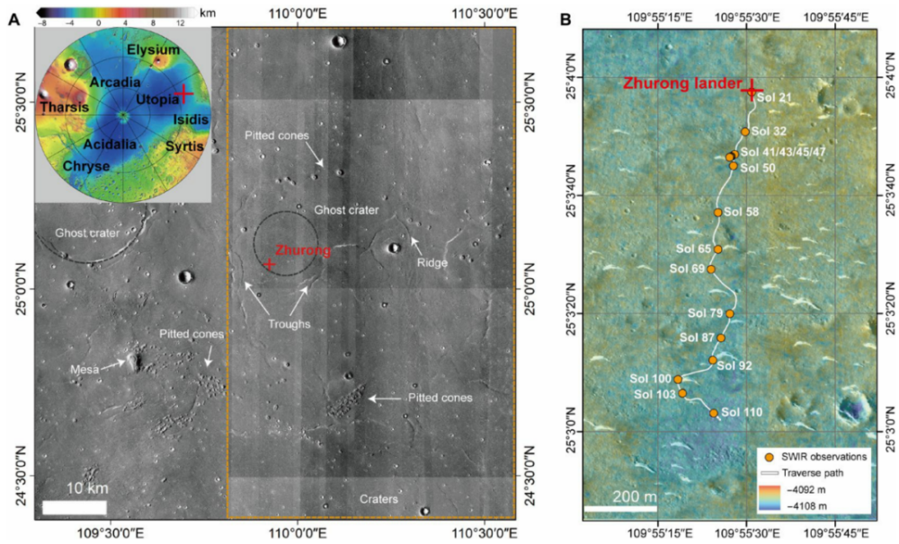 這一發(fā)現(xiàn)對理解火星的氣候環(huán)境演化歷史具有重要意義,也標志著祝融號實現(xiàn)了國際上首次利用巡視器上的短波紅外光譜儀在火星原位探測到含水礦物。