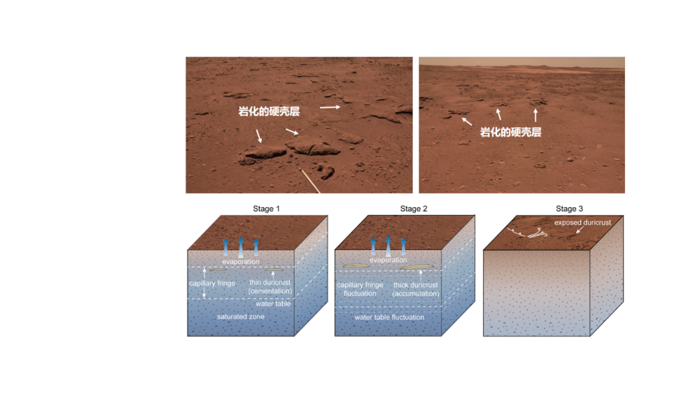研究團隊推斷,這些硬殼層可能是由地下水涌溢或者毛細作用蒸發(fā)結(jié)晶出的鹽類礦物,膠結(jié)了火星土壤后經(jīng)巖化作用形成。
