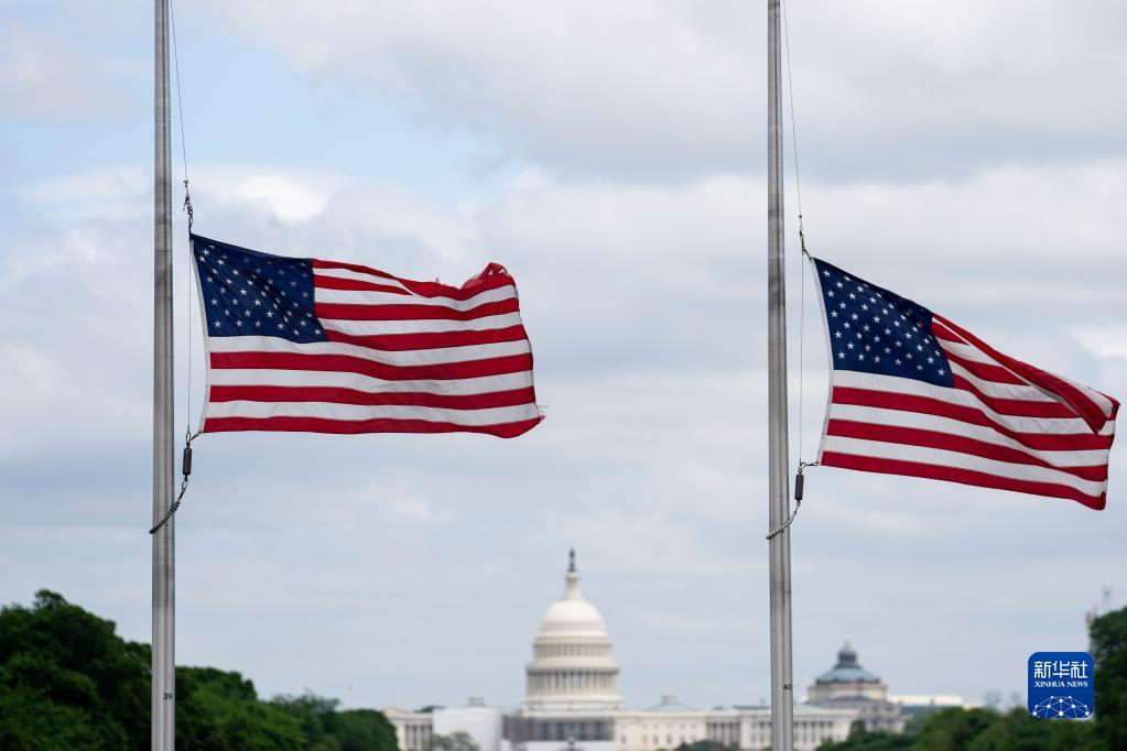5月12日,在美國(guó)華盛頓,華盛頓紀(jì)念碑周圍的美國(guó)國(guó)旗降半旗悼念新冠逝者。新華社記者劉杰攝