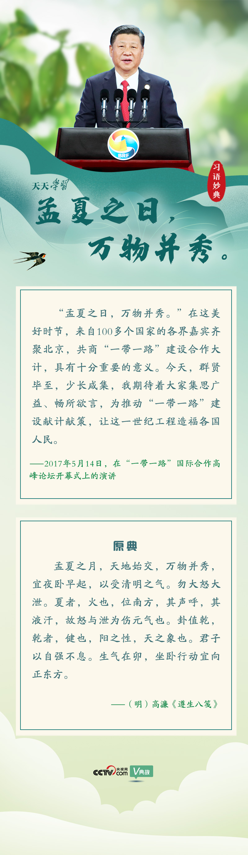 2017年5月14日,習近平主席在北京出席“一帶一路”國際合作高峰論壇開幕式,并發(fā)表題為《攜手推進“一帶一路”建設》的主旨演講。開幕式當天是農歷四月十九日,適值“孟夏之日”。此時的北京初夏剛至,風暖晝長,陽光明媚,藍天、白云、山水和古建筑相映成趣,大地郁郁蔥蔥,一片生機盎然。在演講開場白中,習近平主席將古人成句“孟夏之月,萬物并秀”信手拈來,易“月”為“日”,與眼前萬物勃發(fā)、生機盎然的京城美景相呼應,也讓與會嘉賓們感受到中國人民的熱情,堪稱妙用天成。