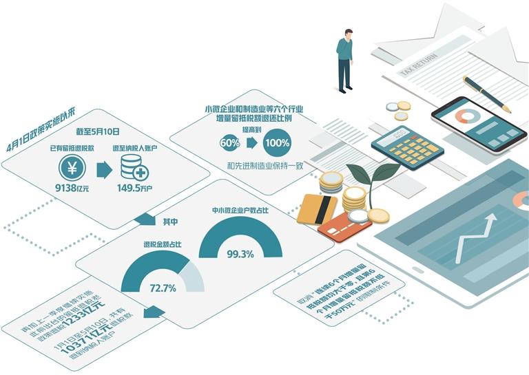 今年增值稅留抵退稅規(guī)模約1.5萬億元。4月1日政策實施以來,截至5月10日,已有9138億元留抵退稅款退至149.5萬戶納稅人賬戶。其中,中小微企業(yè)戶數(shù)占比99.3%,退稅金額占比72.7%,再加上一季度繼續(xù)實施此前出臺的留抵退稅老政策退稅1233億元,1月1日至5月10日,共有10371億元退稅款退到納稅人賬戶,為企業(yè)紓困解難、提振市場主體信心發(fā)揮了重要作用。