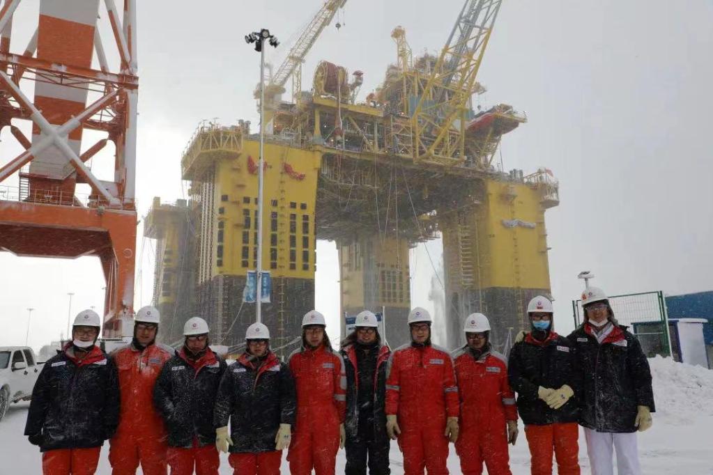 “深海一號”開發(fā)生產(chǎn)團(tuán)隊(duì)在煙臺建造場地合影。(受訪對象供圖)