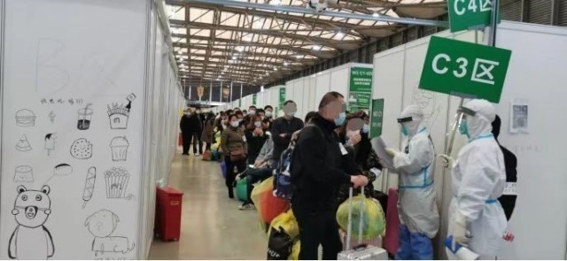 到達新國博方艙醫(yī)院的第一天,方燕紅心理沒有底,連著進了三次艙,把情況帶回駐地反饋給隊員!皼]有見過這么大的方艙!我們醫(yī)院在武漢接管過最大的方艙就1500張床位,而新國博有著14000張床位!苯(jīng)過實地勘察,發(fā)現(xiàn)從三區(qū)兩通道、醫(yī)用防護物資、護士站配備到標示標牌全部已經(jīng)就位,心里很快有了底!叭蕽t(yī)院管理團隊前期已經(jīng)做足工作,迎接我們的到來。有時凌晨兩三點,也總能聯(lián)系到仁濟護理部,及時給我們解決問題。”方燕紅說。