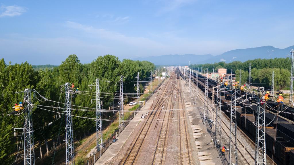 工人正在對大秦鐵路供電設(shè)備進(jìn)行檢修施工。(中國鐵路太原局集團(tuán)有限公司供圖)