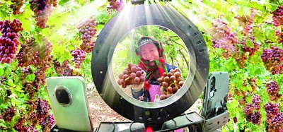 河南省信陽市平橋區(qū)五里鎮(zhèn)九店村葡萄采摘園里,村民正在進行銷售直播。劉世興攝/光明圖片