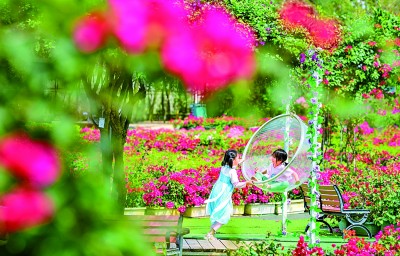 海口市瓊山區(qū)紅旗鎮(zhèn)邊洋村三角梅共享農(nóng)莊內(nèi),兩位小朋友正在玩耍?档橇軘z/光明圖片