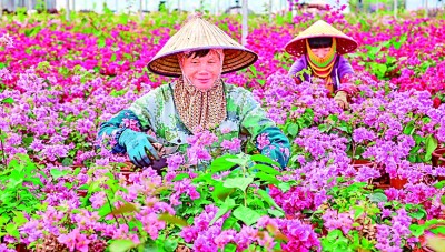 在臨高縣花卉產(chǎn)業(yè)觀光園內(nèi),一簇簇三角梅生長旺盛,村民們正在修剪花枝,打理園區(qū)。陳元才攝/光明圖片