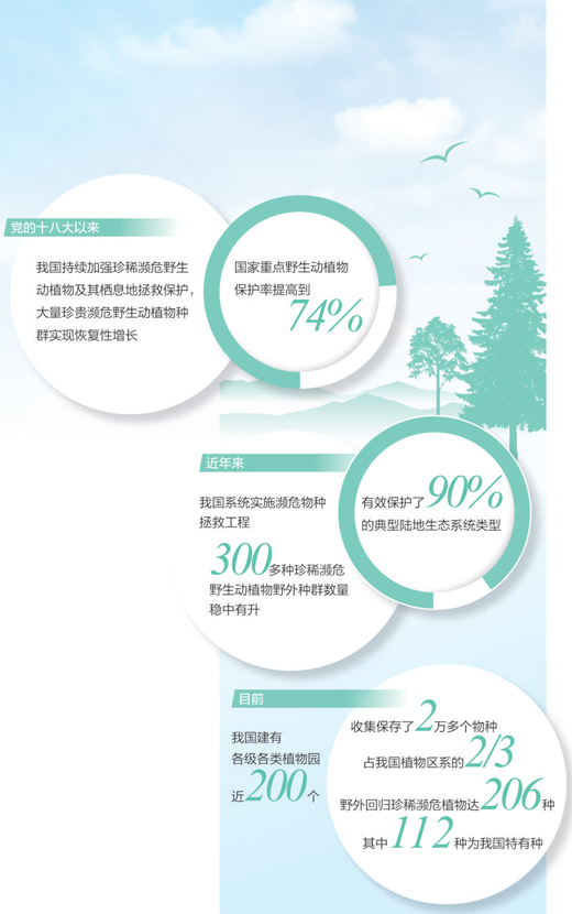 近年來,我國系統(tǒng)實施瀕危物種拯救工程,采取就地保護(hù)、遷地保護(hù)、放歸(回歸)自然、人工繁育(培植)等措施,有效保護(hù)了90%的典型陸地生態(tài)系統(tǒng)類型,300多種珍稀瀕危野生動植物野外種群數(shù)量穩(wěn)中有升。目前,我國建有各級各類植物園近200個,收集保存了2萬多個物種,占我國植物區(qū)系的2/3。野外回歸珍稀瀕危植物達(dá)到206種,其中112種為我國特有種。麋鹿、普氏野馬曾一度在野外消失,目前通過人工繁育等方式,總數(shù)分別達(dá)近1萬只和700只左右,并成功實施放歸自然,重新建立了野外種群,生存區(qū)域和范圍不斷擴(kuò)大。