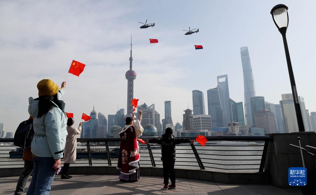兩架懸掛國(guó)旗和警旗的警航直升機(jī)飛過(guò)上海外灘,慶祝首個(gè)“中國(guó)人民警察節(jié)”(2021年1月10日攝)。新華社記者 方喆 攝