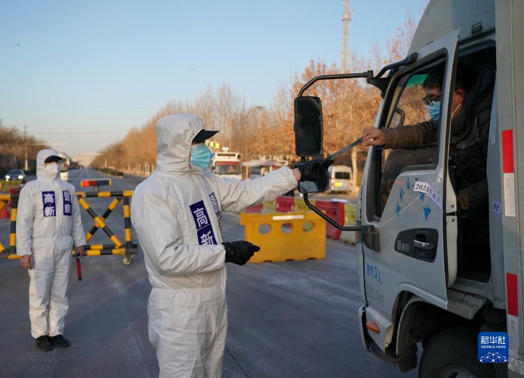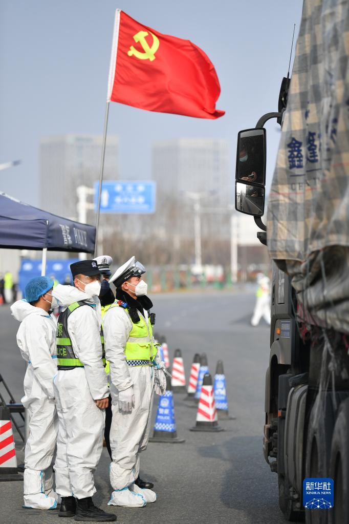 石家莊市公安局高新技術(shù)產(chǎn)業(yè)開發(fā)區(qū)公安分局民警在藁城區(qū)通往市區(qū)的路口執(zhí)勤(2021年1月10日攝)。當(dāng)日是首個(gè)“中國(guó)人民警察節(jié)”。新華社記者楊世堯攝