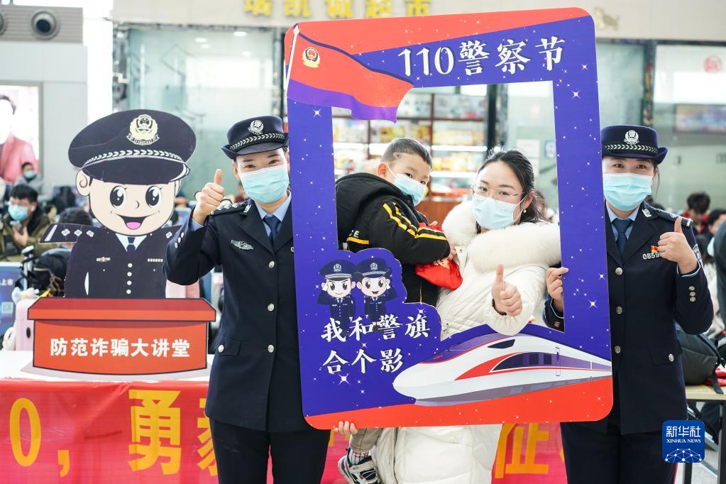 南京鐵路公安處聯(lián)合南京市公安局公交治安分局在南京火車站舉行迎接“中國(guó)人民警察節(jié)”活動(dòng),民警和旅客在活動(dòng)上合影(2022年1月7日攝)。新華社記者季春鵬攝