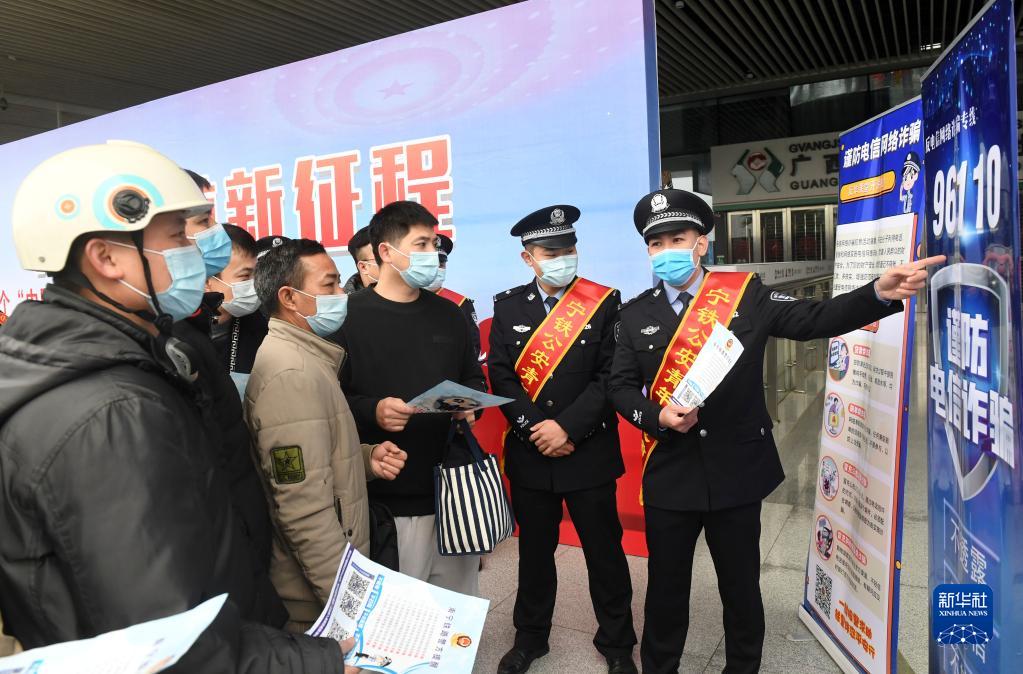 在廣西南寧東站,南寧鐵路公安處民警向旅客宣傳防電信詐騙常識(shí)(2022年1月9日攝)。新華社記者陸波岸攝