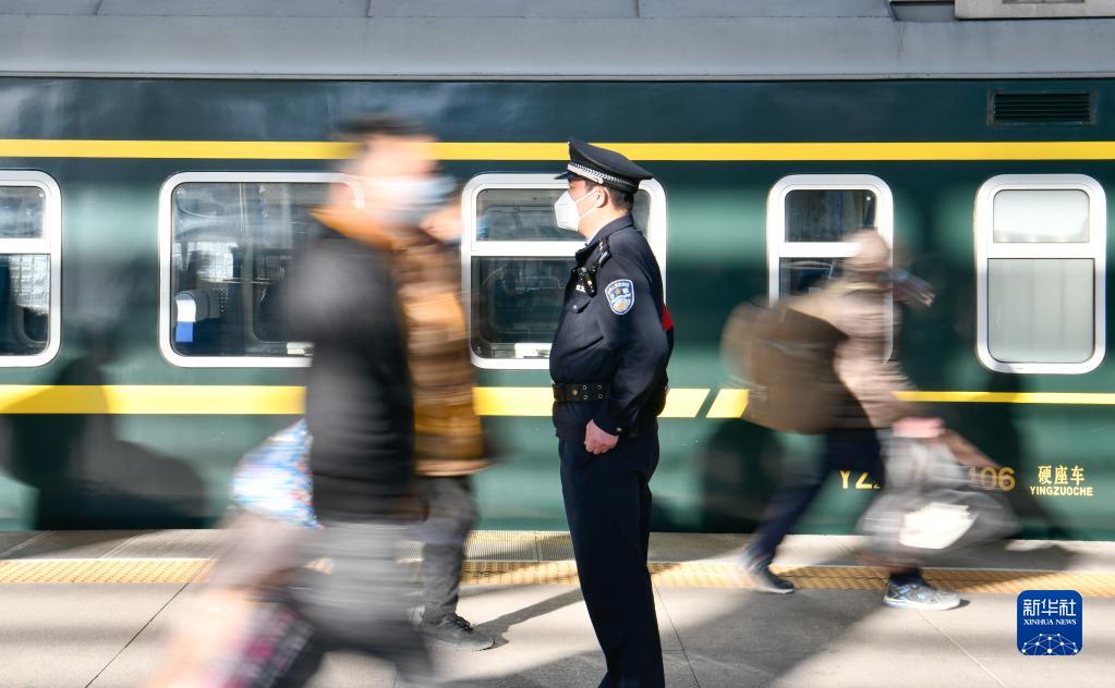 北京鐵路公安局天津鐵路公安處乘警支隊(duì)四大隊(duì)民警高天順在天津站執(zhí)勤(2021年2月3日攝)。新華社記者孫凡越攝