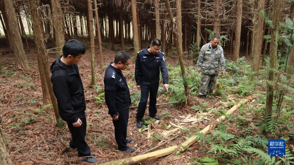 福建省南平市浦城縣公安局石陂森林派出所所長(zhǎng)郭曉強(qiáng)(右二)在盜伐林木案件現(xiàn)場(chǎng)分析作案動(dòng)機(jī)(2020年12月11日攝)。新華社記者趙雪彤?dāng)z