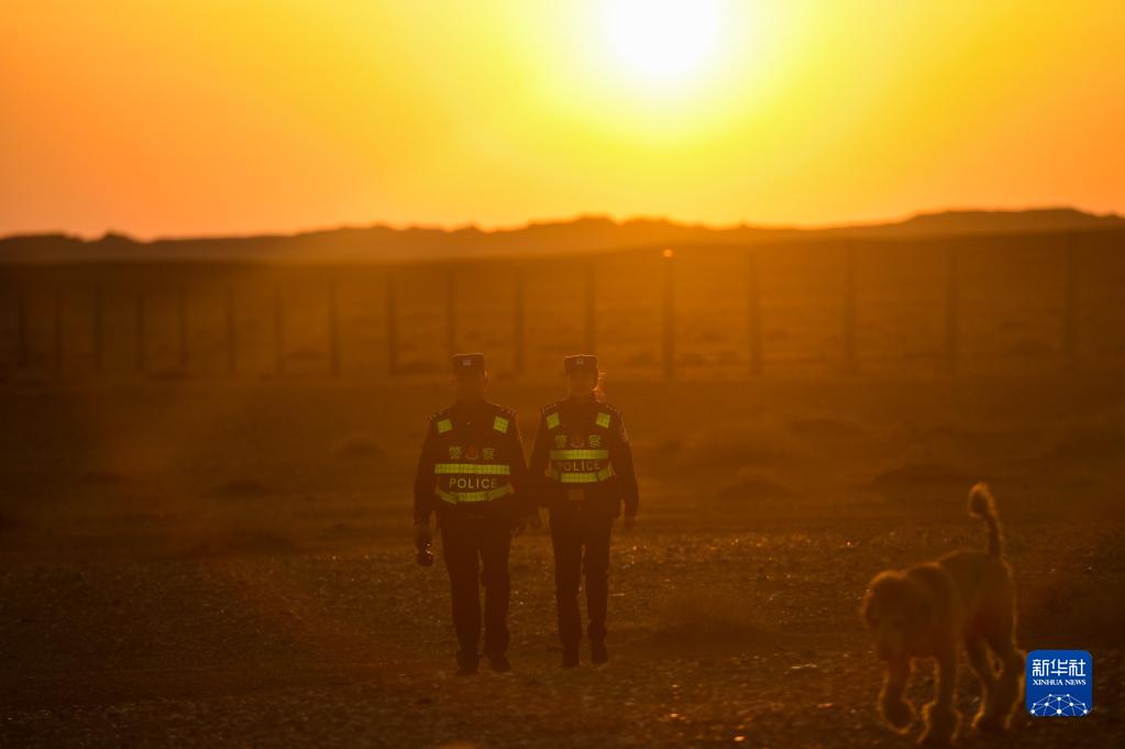 內(nèi)蒙古阿拉善邊境管理支隊(duì)銀根邊境派出所戍邊夫妻警務(wù)室的徐乃超和李文娜在邊境線附近巡邏(2022年4月18日攝)。新華社記者彭源攝