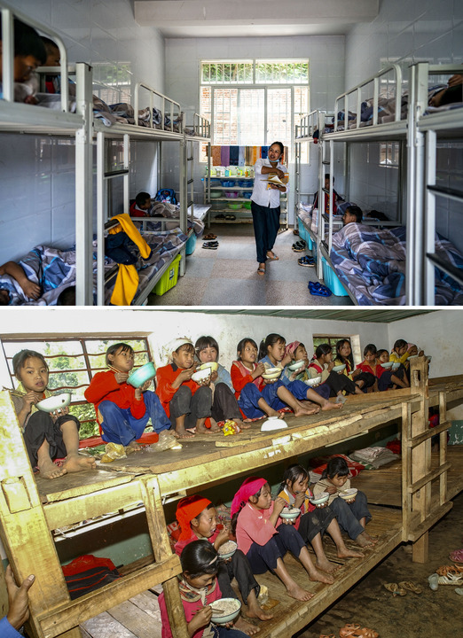 拼版照片:上圖為2021年9月8日,云南省瀾滄拉祜族自治縣木戛鄉(xiāng)哈卜嗎村小學(xué)的學(xué)生在宿舍休息(新華社記者江文耀攝);下圖為2003年,哈卜嗎村小學(xué)的學(xué)生在宿舍吃飯(新華社記者秦晴攝)。新華社發(fā)