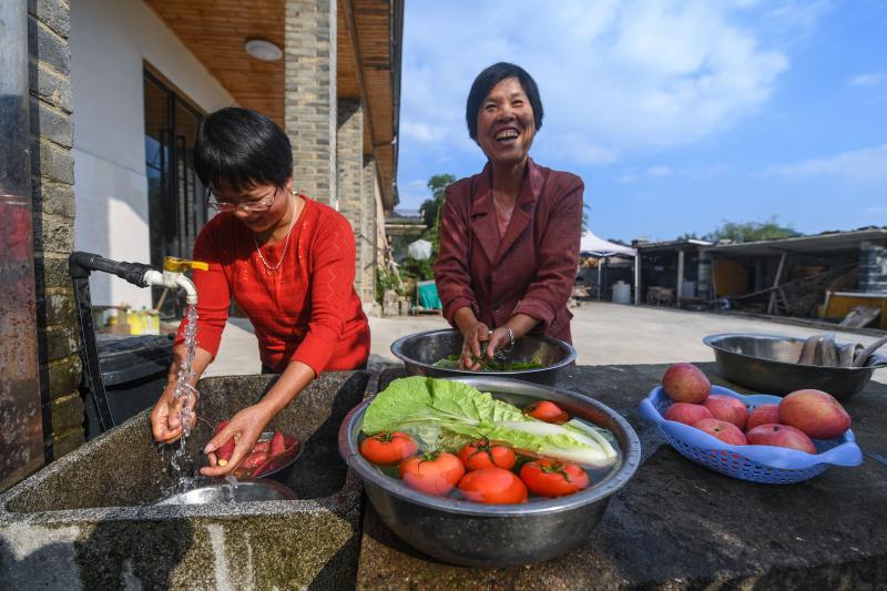 浙江省杭州市臨安區(qū)天目山鎮(zhèn)九獅村村民在家門口洗菜(2020年10月10日攝)。新華社記者 徐昱 攝