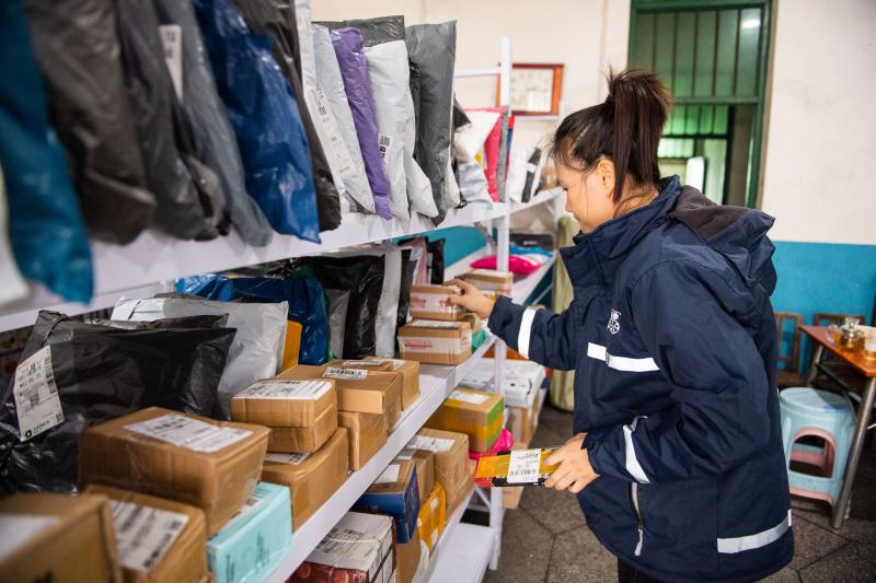 湖南省衡陽(yáng)市耒陽(yáng)市黃市鎮(zhèn)新生快遞鄉(xiāng)村服務(wù)站的站長(zhǎng)胡夏在整理快遞(2021年11月3日攝)。新華社記者 陳思汗 攝