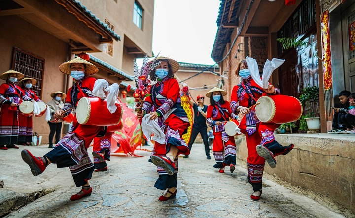 云南省昆明市晉寧區(qū)福安村村民在村里一年一度的民俗活動(dòng)上表演舞蹈(2022年4月5日攝)。新華社記者 江文耀 攝